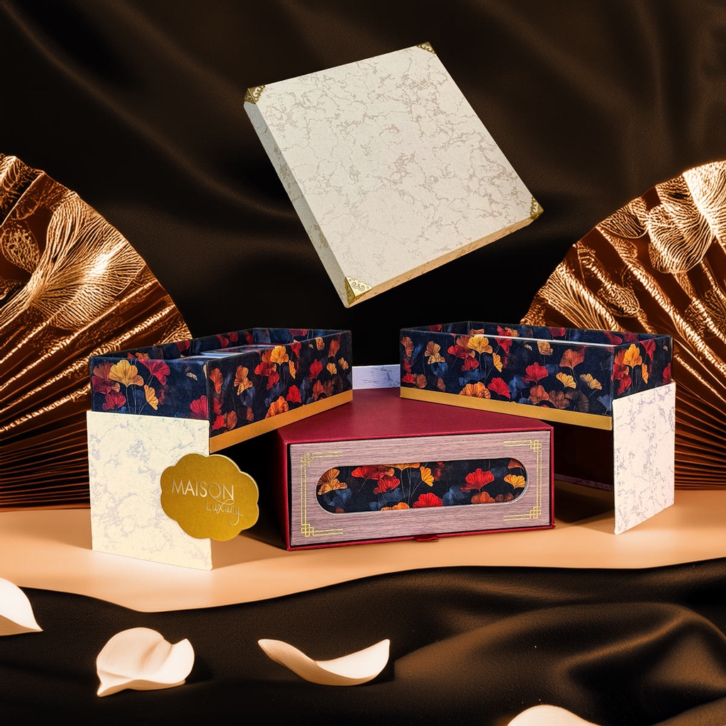 Toàn bộ hộp sử dụng giấy giả da cao cấp, có hoa văn vân đá 3D nổi mang đến hiệu ứng thị giác đậm nét, vừa hiện đại vừa sang trọng. Bên trong, họa tiết lá ginkgo (lá bạch quả) – biểu tượng của may mắn và trường thọ – được in sắc nét, phủ màng ánh kim giúp từng chi tiết trở nên nổi bật, tạo điểm nhấn tinh xảo hiếm thấy.