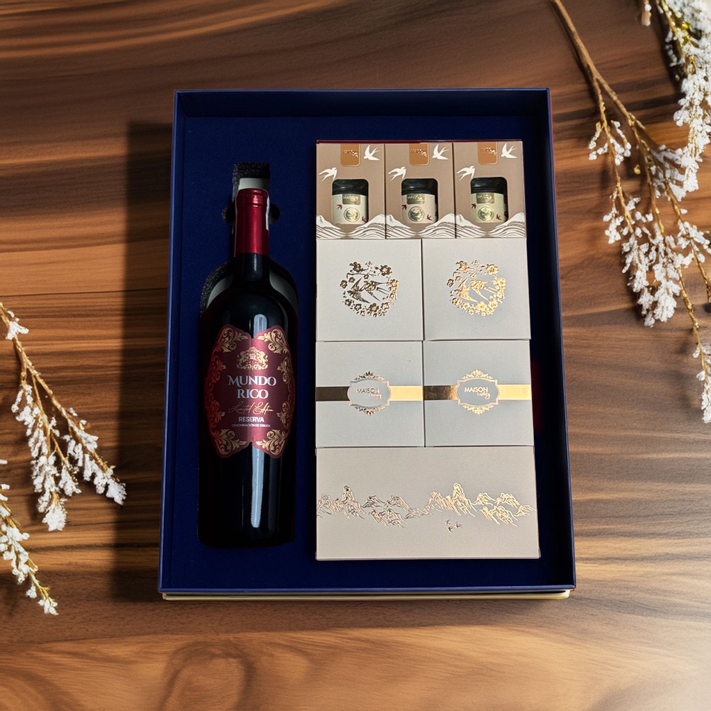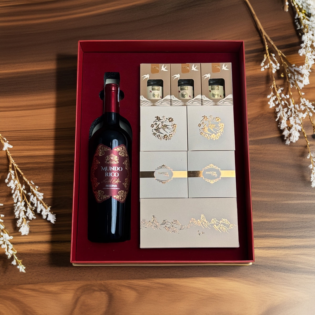 Bên trong là rượu vang nhập khẩu thượng hạng kết hợp cùng các sản phẩm Maison chọn lọc, tạo nên món quà Tết Maison ý nghĩa – vừa đẹp mắt, vừa đậm vị Tết truyền thống.